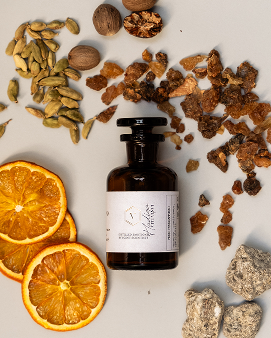 Olfactory Pyramid: Sweet orange, red mandarin, bergamot, cardamom, nutmeg, elemi, frankincense, myrrh, and ambrette.